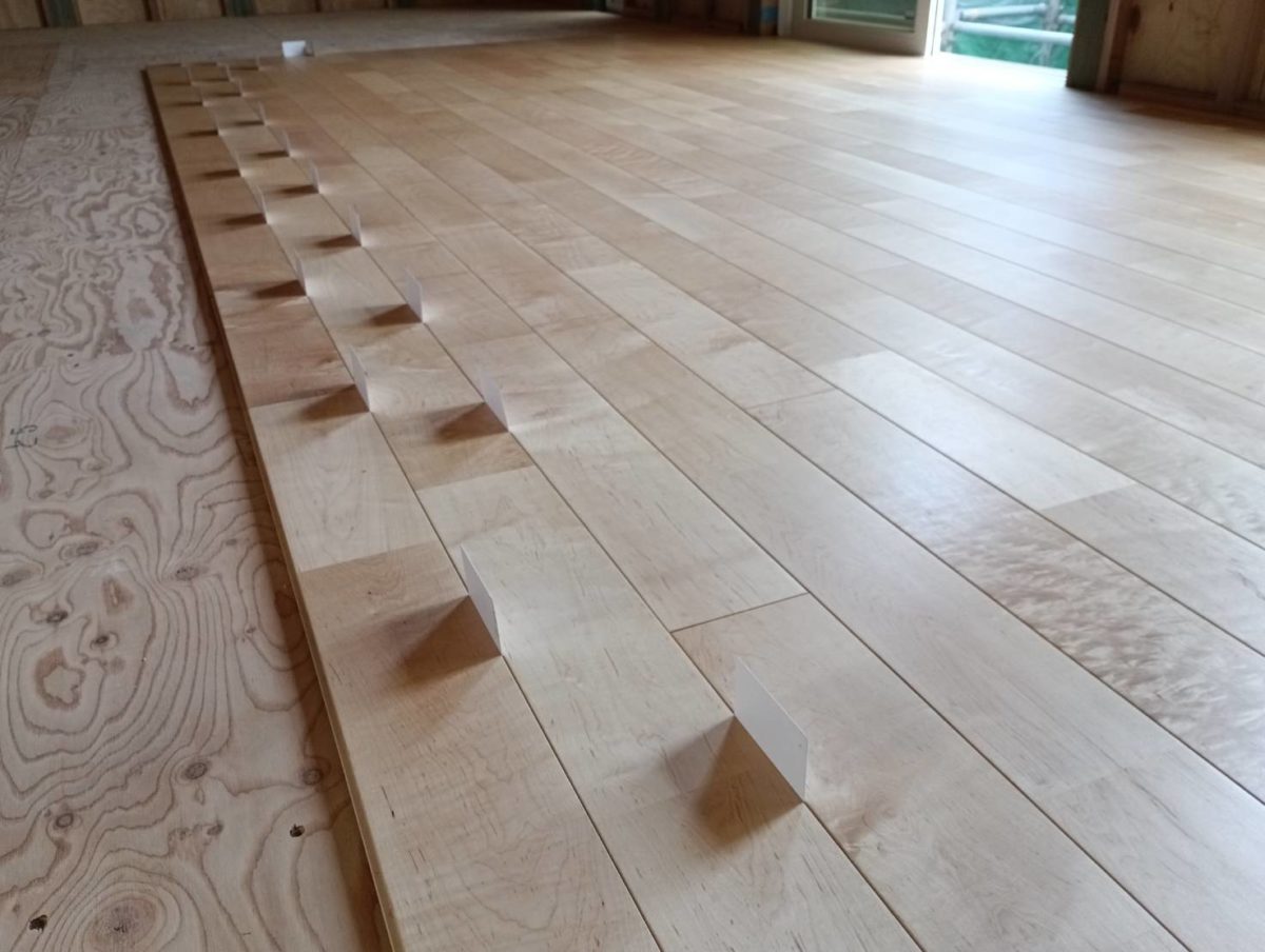 無垢フローリング施工には欠かせないスペーサーをはさみながら、貼り方作業開始です。