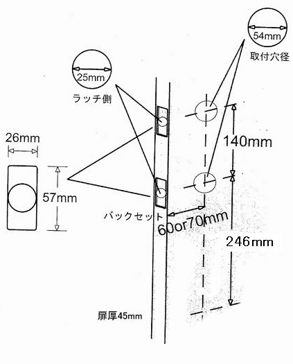 ドア厚は35~45mmまで対応、バックセット(ドア小口から芯棒の中心)までは60/70mm切替式です。