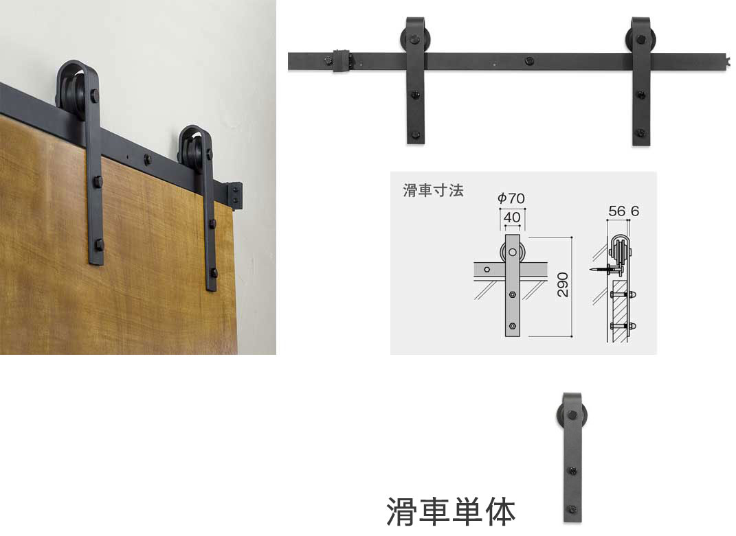 欧米では、バーン(納屋)などで見られたドアスタイルで、近年では欧米でもインテリアアイテムとして人気のドア用ハードウェアです。ドアのレールに意匠性を持たせて見せると言うのが特徴です。ドアとの組み合わせで、クラシカル調やポップ調など、様々なテイストにできます。施工後に扉が欲しいと思ったときでも容易に施工ができ、2本のレールを使うことで、両開きも可能。店舗や住宅、様々なシーンで利用できます。